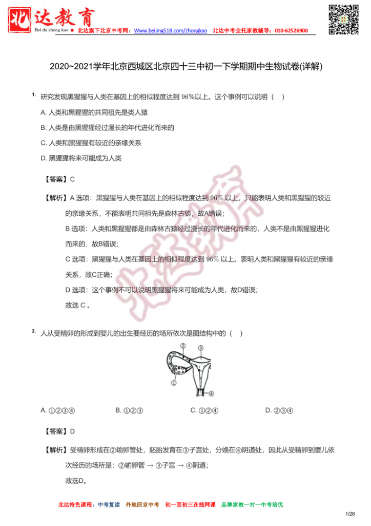 北京四十三中2021年初一下期中生物试卷原卷版+解析版。admw360中考复读学校教研组收集整理,分享给大家。