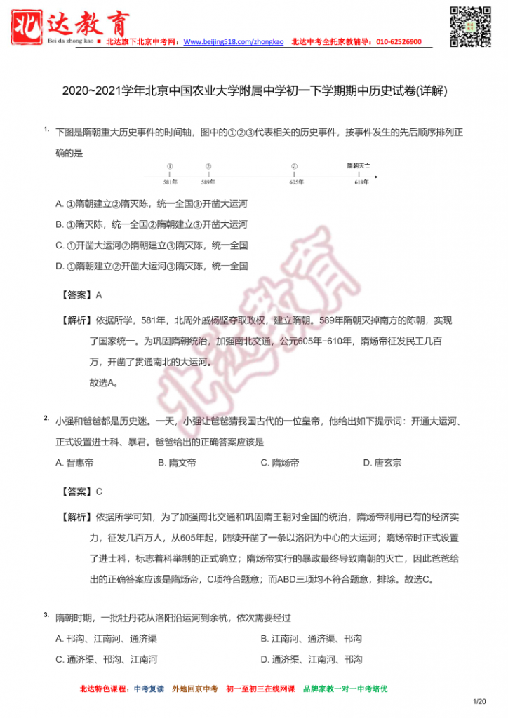 北京中国农大附中2021年初一下期中历史试卷原卷版+解析版。admw360中考复读学校教研组收集整理,分享给大家。