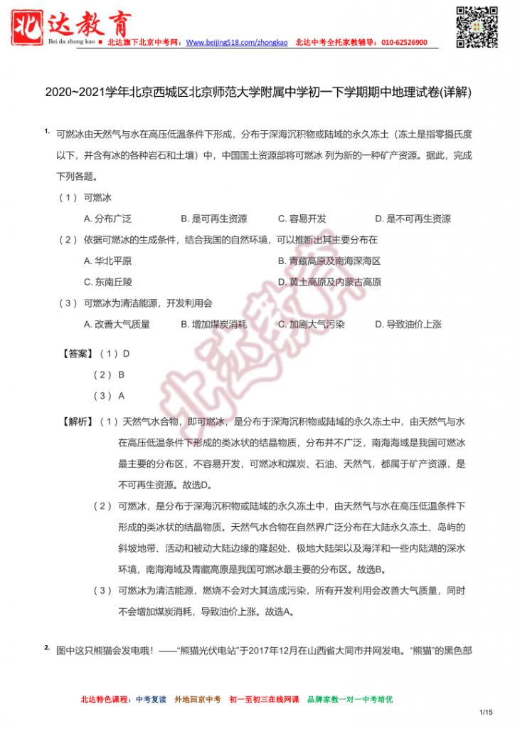 北师大附中2021年初一下期中地理试卷原卷版+解析版。admw360中考复读学校教研组收集整理,分享给大家。