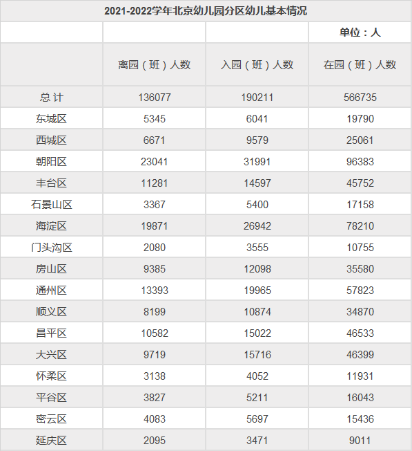 2021-2022学年北京各区幼升小人数、幼儿园招生人数