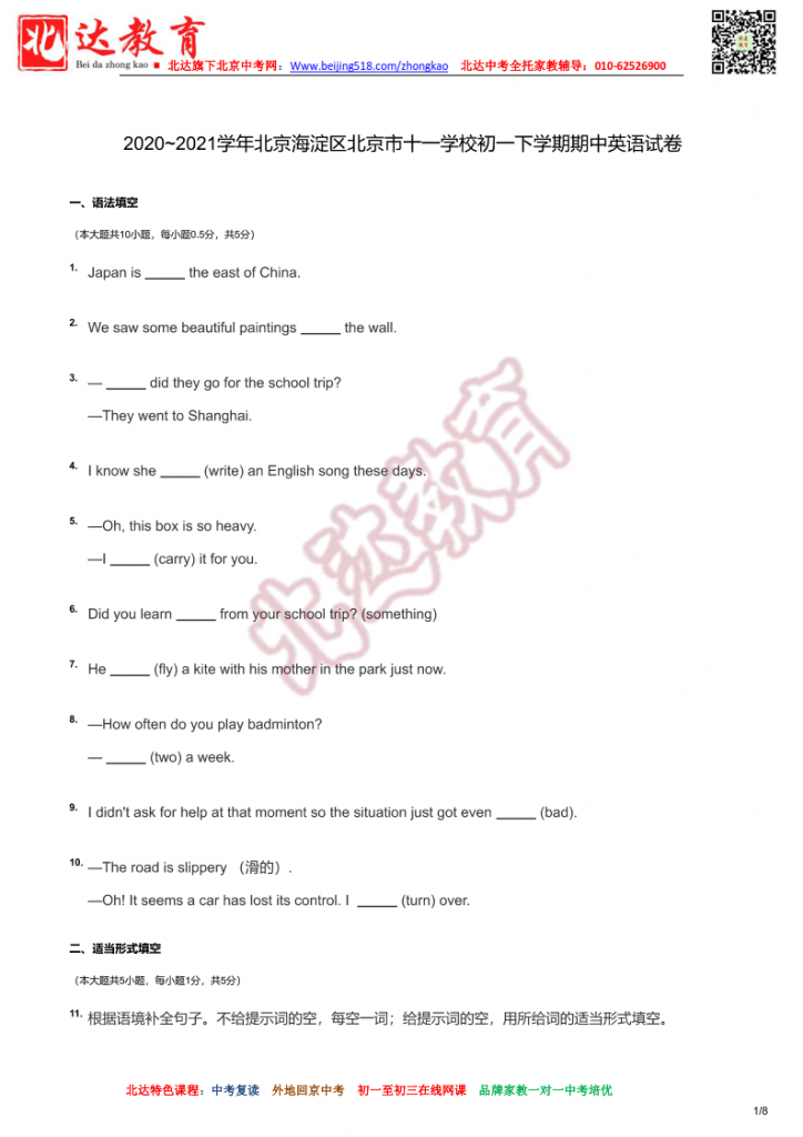 北京十一学校2021初一下学期期中英语试卷及详解。admw360中考复读学校教研组收集整理,分享给大家。