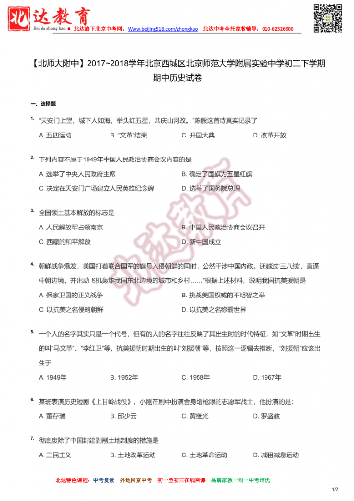 北师大附实验2021初二下期中历史试卷及详解。admw360中考复读学校教研组收集整理,分享给大家。