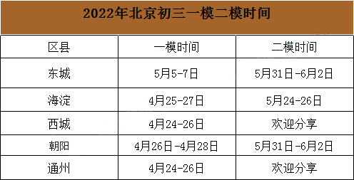 2022初三一模将近,你知道一模的重要性吗?各区一模什么时候进行?我们收集了海淀、东城、西城、朝阳等5区的一模时间,欢迎大家分享更多区的一模、二模时间。