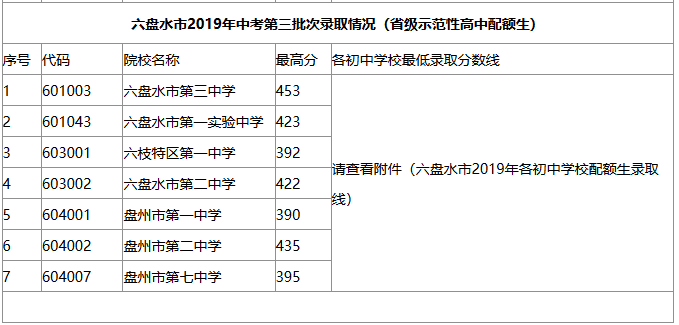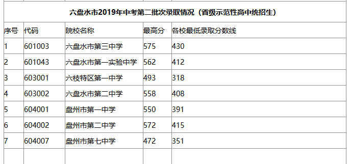 | 1 | 603002 | 六盘水市第二中学 | 650 | 请查看附件(六盘水市2018年各初中学校配额生录取线) |