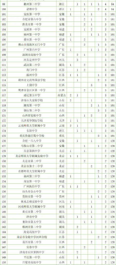 2、人大附紧追其后。一直以来,人大附在竞赛国集、金牌人数上表现出了较大的优势,本次也不例外,以41人的成绩位居第三。其中数学成绩最好,以下入围了22人,但是化学、生物、信息学略差都只有两三个人,有些瘸腿。湖南师范大学附属中学、华中师范大学第一附属中学势均力敌,以38、37人的成绩最终占领前五的宝座。