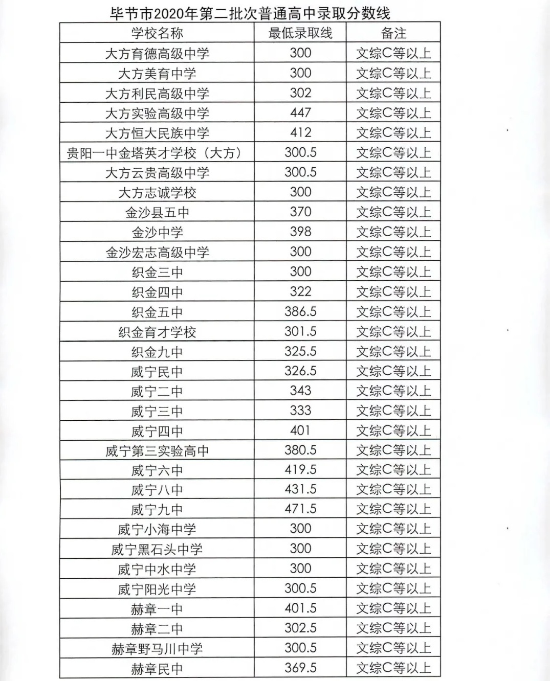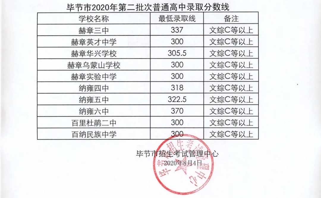 2020毕节录取分数线