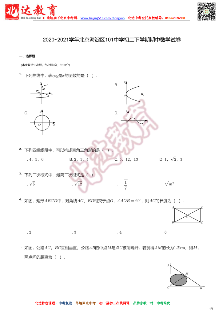 北京一零一中学2021初二下学期期中数学试卷及详解。admw360中考复读学校教研组收集整理,分享给大家。