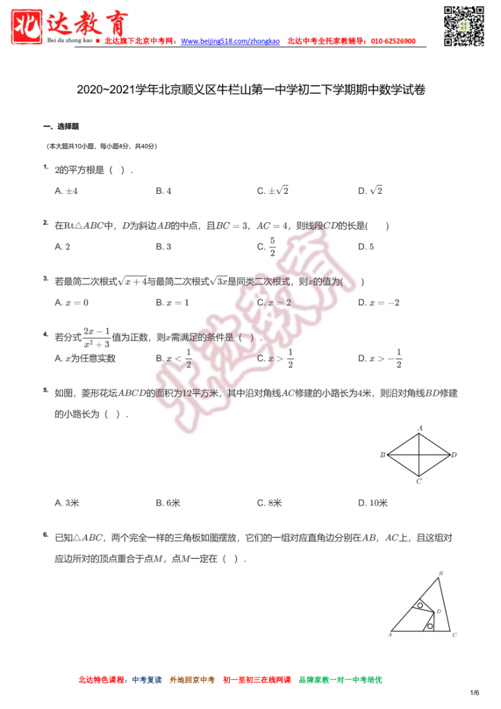 北京牛栏山一中2021初二下期中数学试卷及详解。admw360中考复读学校教研组收集整理,分享给大家。