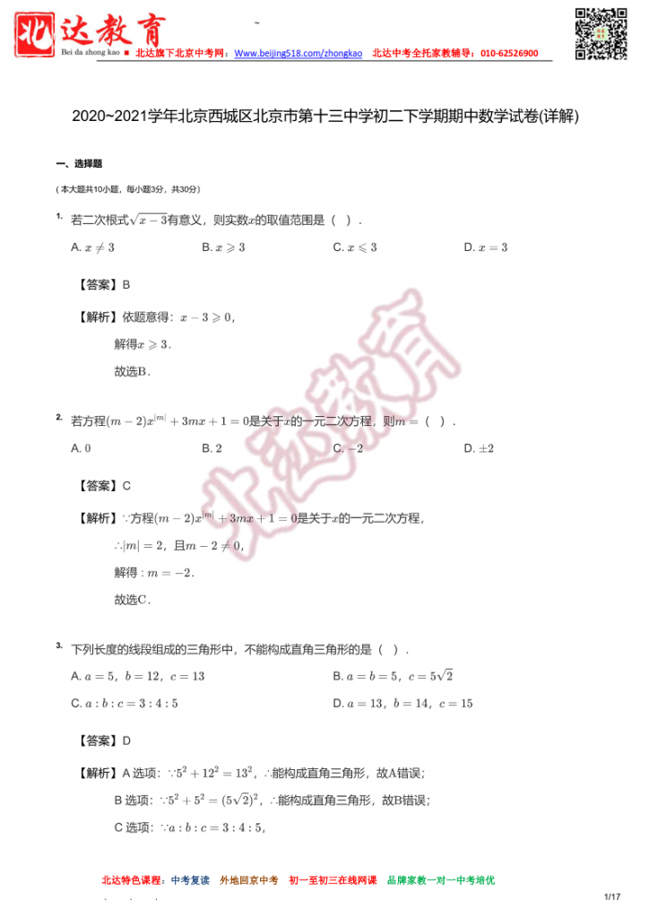 北京十三中2021初二下学期中数学试卷及详解。admw360中考复读学校教研组收集整理,分享给大家。