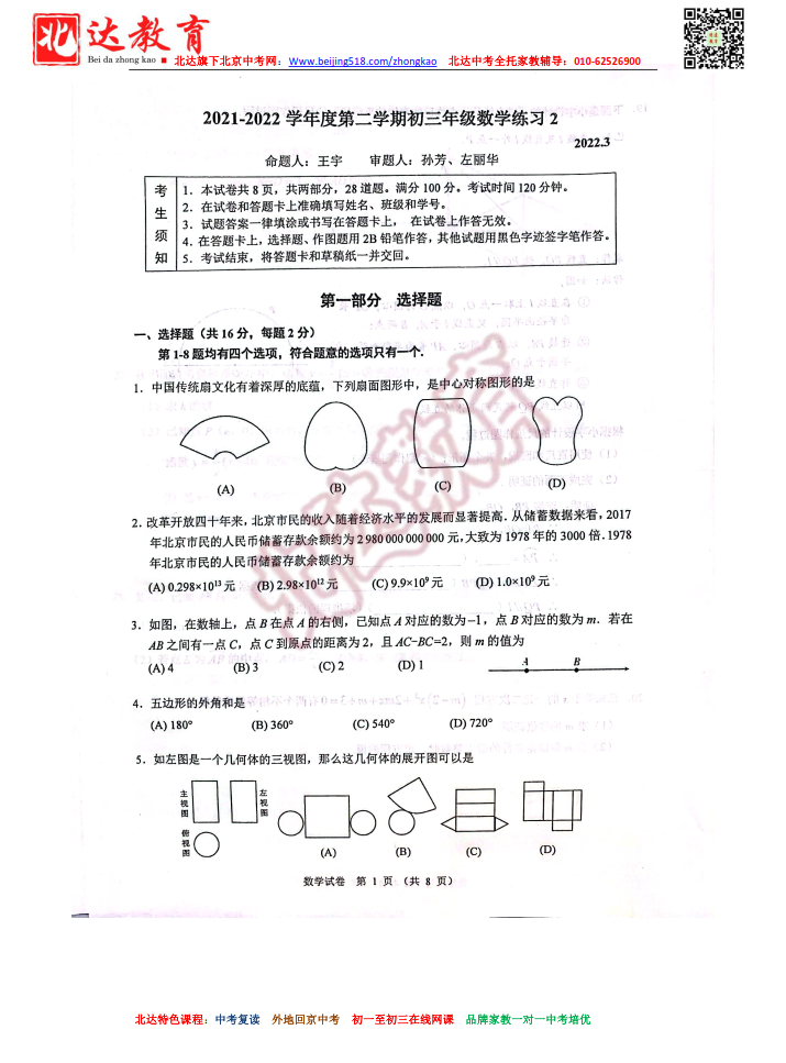人大附中初三2022年3月数学练习2。admw360中考复读学校教研组收集整理,分享给大家。