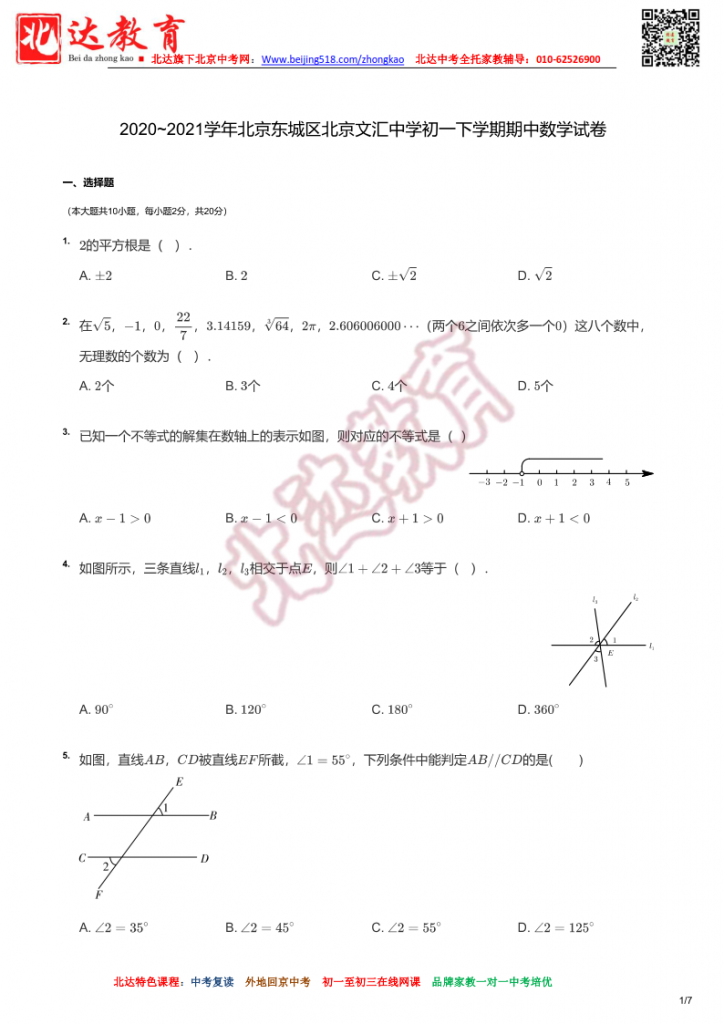 北京文汇中学2021初一下期中数学试卷及详解。admw360中考复读学校教研组收集整理,分享给大家。
