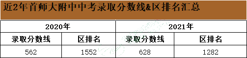 以下为2020-2021年首师附近2年录取分数线和区排名,仅供参考,各位考生可根据自己平时的考试成绩及其区排名来判断自己进入首师附的几率。