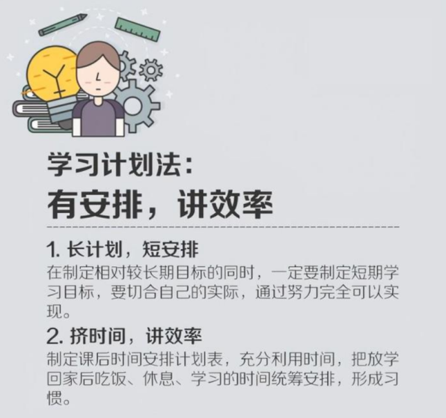 高效的学习离不开合理的学习计划,一份合理的学习计划应该是有长有短的,长期计划需要一个目标,比如一学期的整体计划、一学年的整体计划等。
