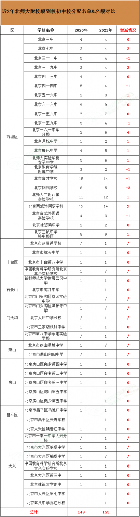 4、2021年北师大附校额到校招生计划相比2020年增加了10人,北师大附校额到校招生不仅面向本区招生,也有少量面向其他区招生计划。接下来为各位考生详细介绍哪些初中校有北师大二附校额到校名额?分别有多少及近2年各初中校校额到校名额增减情况。