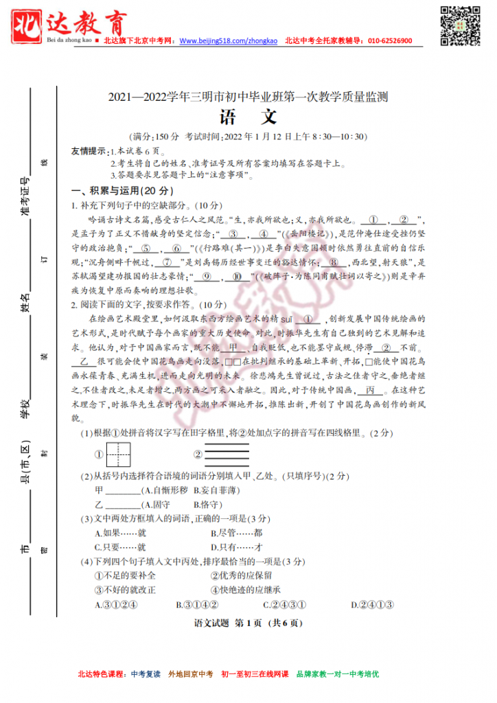 福建三明2022初三上期末语文试卷