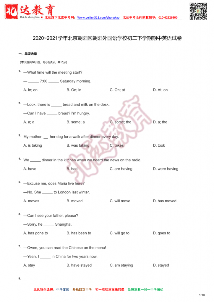 北京朝阳外国语学校2021初二下期中英语试卷(详解)