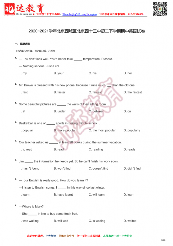 北京四十三中2021初二下期中英语试题及答案。admw360中考复读学校教研组收集整理,分享给大家。