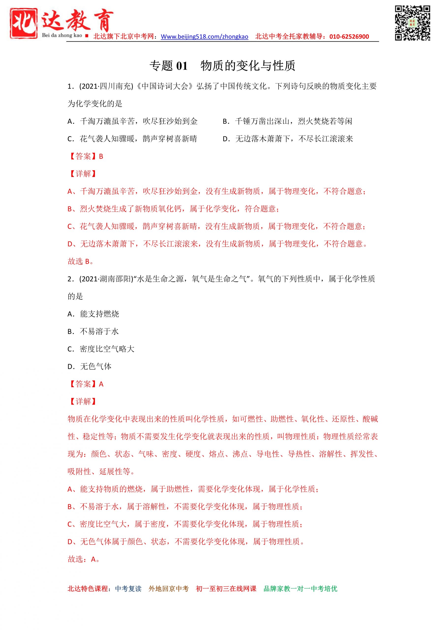 专题01物质的变化与性质-2021年中考化学真题分类训练(第01期)(教师版含解析).doc