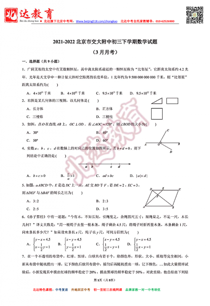 交大附中2022初三下3月月考数学试题。admw360中考复读学校教研组收集整理,分享给大家。