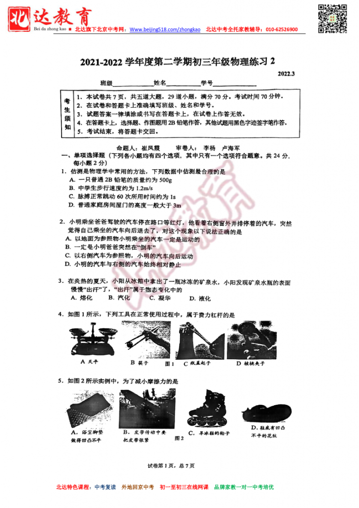 北京人大附中202203初三物理试题及答案。admw360中考复读学校教研组收集整理,分享给大家。