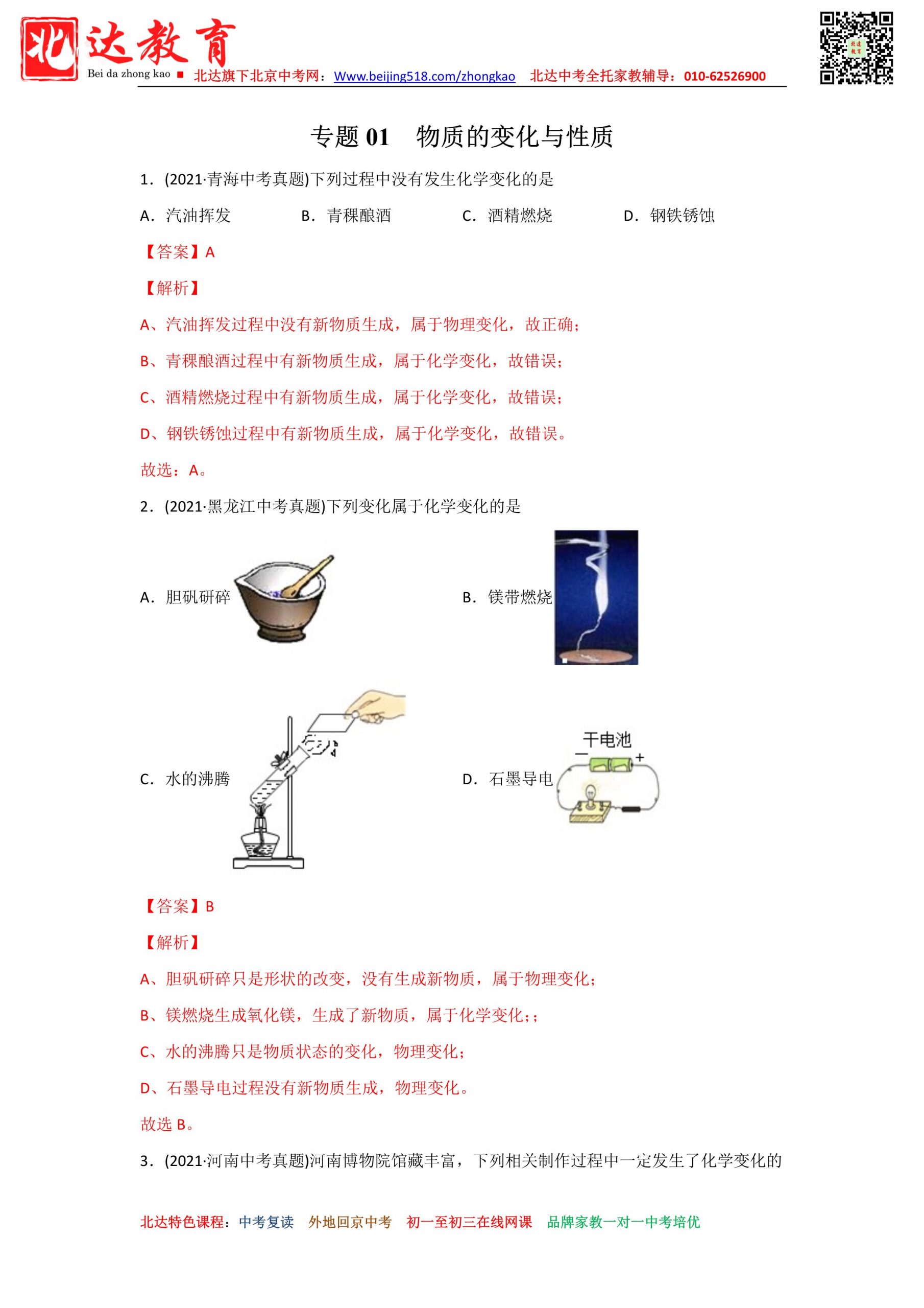 专题01 物质的变化与性质-2021年中考化学真题分类训练(第03期)(教师版含解析).doc