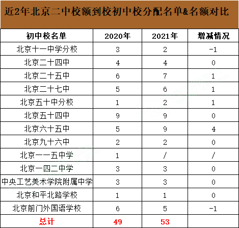 3、近2年北京二中校额到校仅面向本区招生,2021年相比2020年增加了4人。接下来为各位考生详细介绍哪些初中校有北京二中校额到校名额?分别有多少及近2年各初中校校额到校名额增减情况。