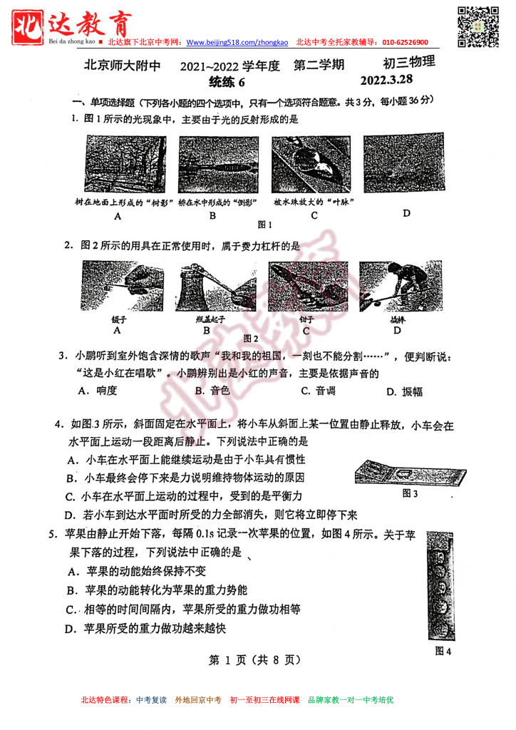 北师大附中20220328初三物理统练6试题及答案。admw360中考复读学校教研组收集整理,分享给大家。