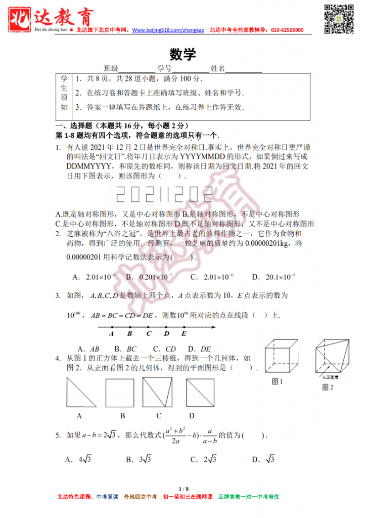 北京四中2022年4月初三下数学练习卷。admw360中考复读学校教研组收集整理,分享给大家。