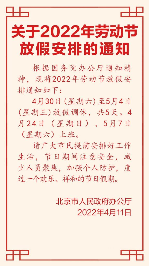 今天北京市人民政府办公厅正式发布“关于2022年劳动节放假安排的通知”,我们整理了相关信息,分享给大家。