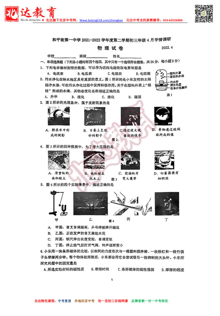 北京和平街一中202204初三下学情调研物理试题。admw360中考复读学校教研组收集整理,分享给大家。