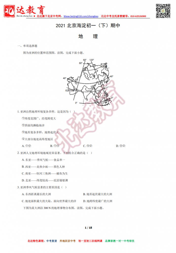 北京海淀2021初一下期中地理(教师版)。admw360中考复读学校教研组收集整理,分享给大家。