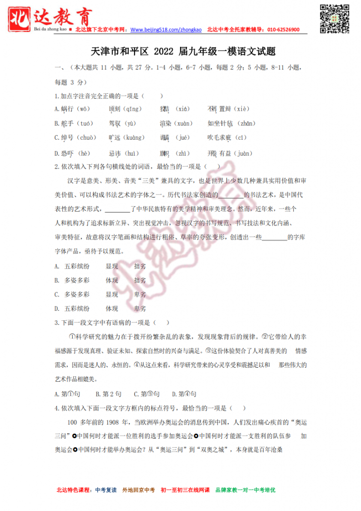 天津和平区2022届九年级一模试题及答案汇总。admw360中考复读学校教研组收集整理,分享给大家。