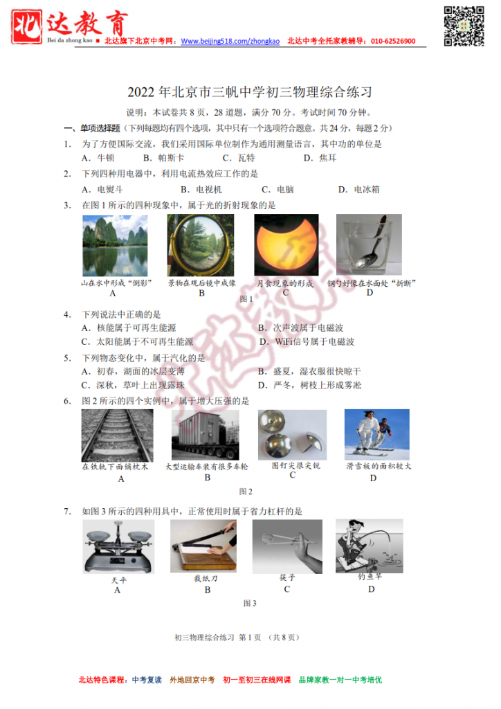 北京三帆中学2022初三物理综合练习卷。admw360中考复读学校教研组收集整理,分享给大家。