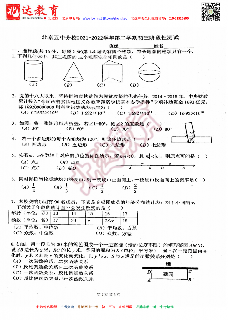 北京五中分校2022初三零模数学试卷。admw360中考复读学校教研组收集整理,分享给大家。