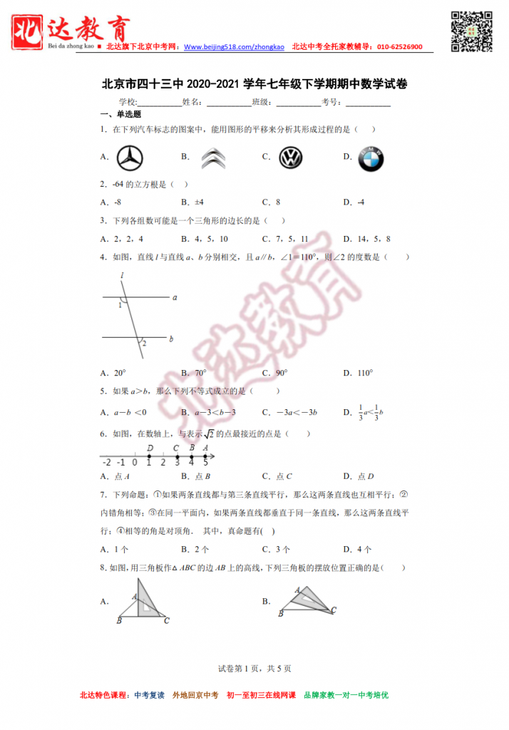 北京四十三中2021初一下期中数学试题及答案。admw360中考复读学校教研组收集整理,分享给大家。