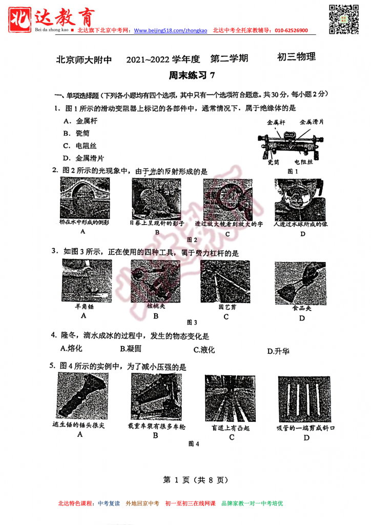 北师大附中2022初三下物理统练试题。admw360中考复读学校教研组收集整理,分享给大家。