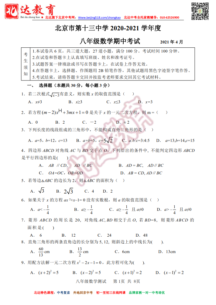 北京十三中2021初二下数学期中试题与参考答案。admw360中考复读学校教研组收集整理,分享给大家。 admw360中考复读,外地回京全日制 ★2022中考复读全日制,应届生全日制,外地回京全日制采…