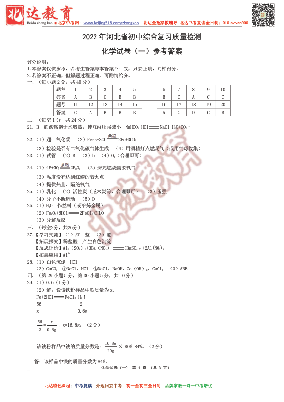 2022年河北省邯郸市邯山区芳园实验中学中考一模化学答案