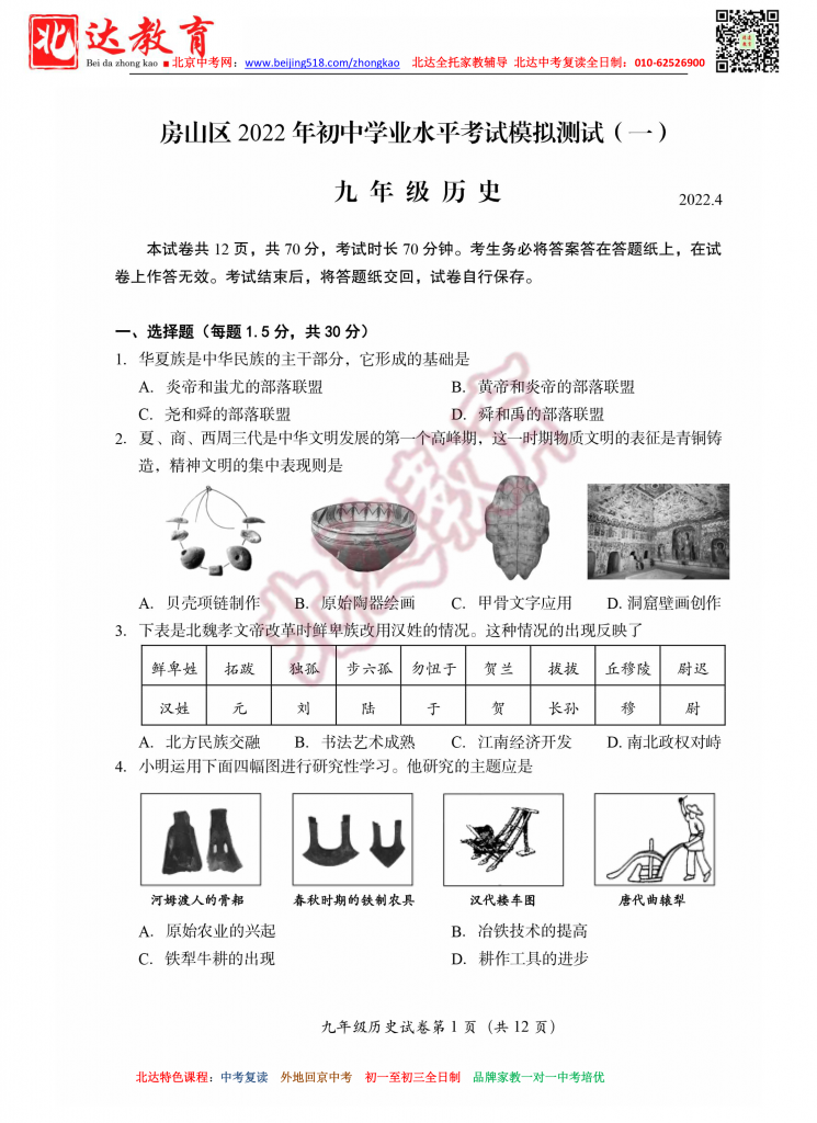 北京房山2022初三一模历史试题及答案(高清版)。admw360中考复读学校教研组收集整理,分享给大家。