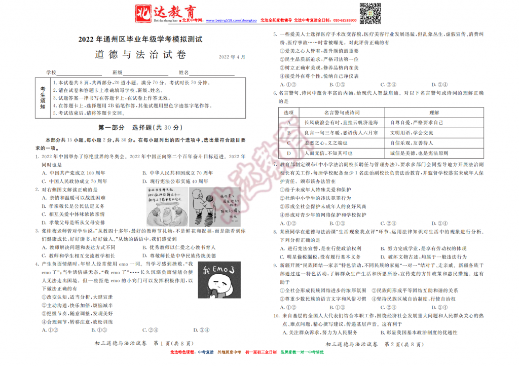 北京通州2022初三一模道法试题及答案(高清版)。admw360中考复读学校教研组收集整理,分享给大家。