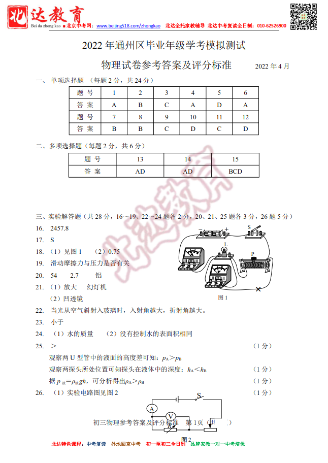 北京通州2022初三一模物理答案(高清版)。admw360中考复读学校教研组收集整理,分享给大家。
