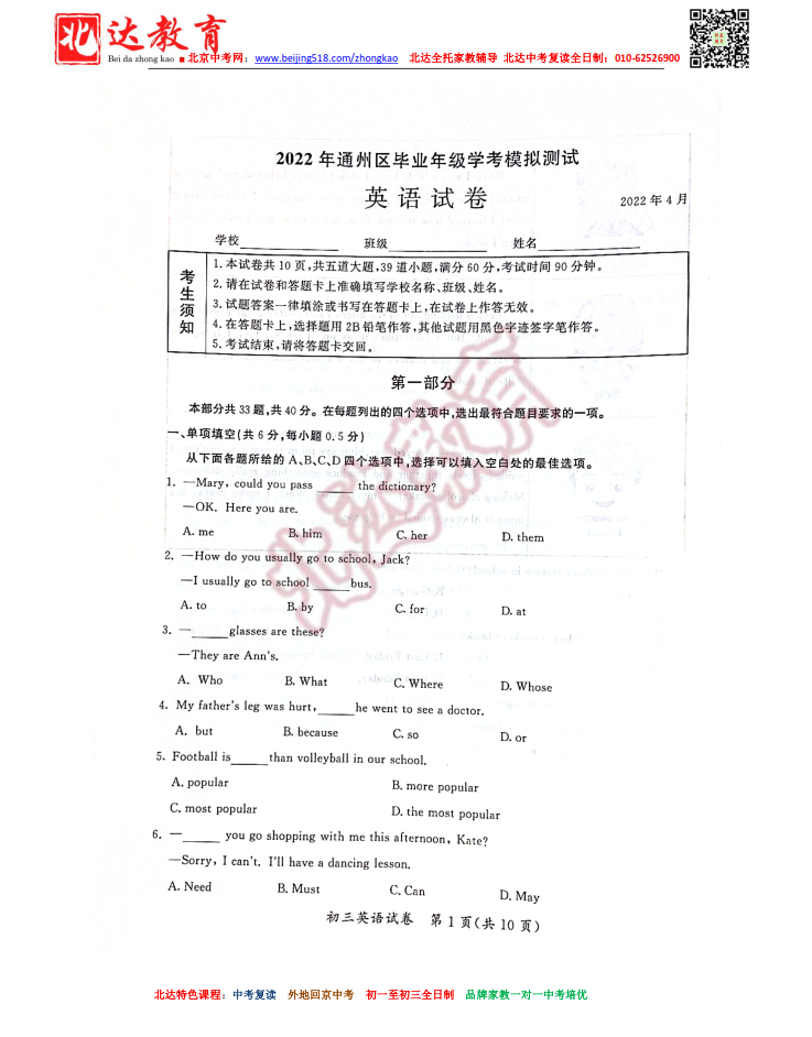 北京通州2022初三一模英语试题(高清版)。admw360中考复读学校教研组收集整理,分享给大家。
