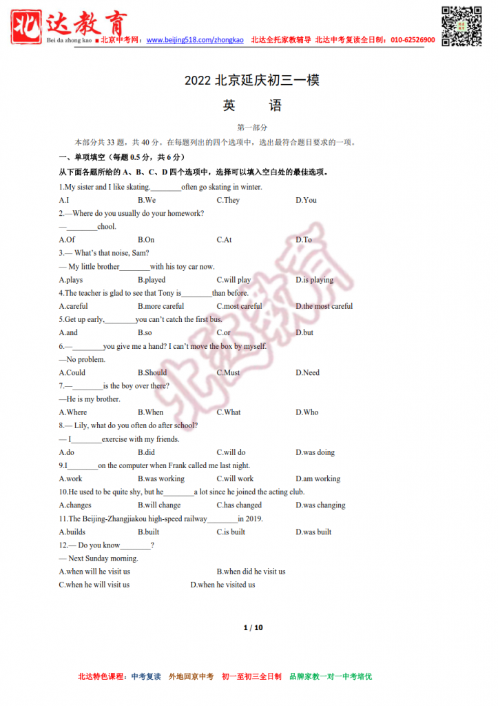 北京延庆2022初三一模英语试卷及答案(高清版)