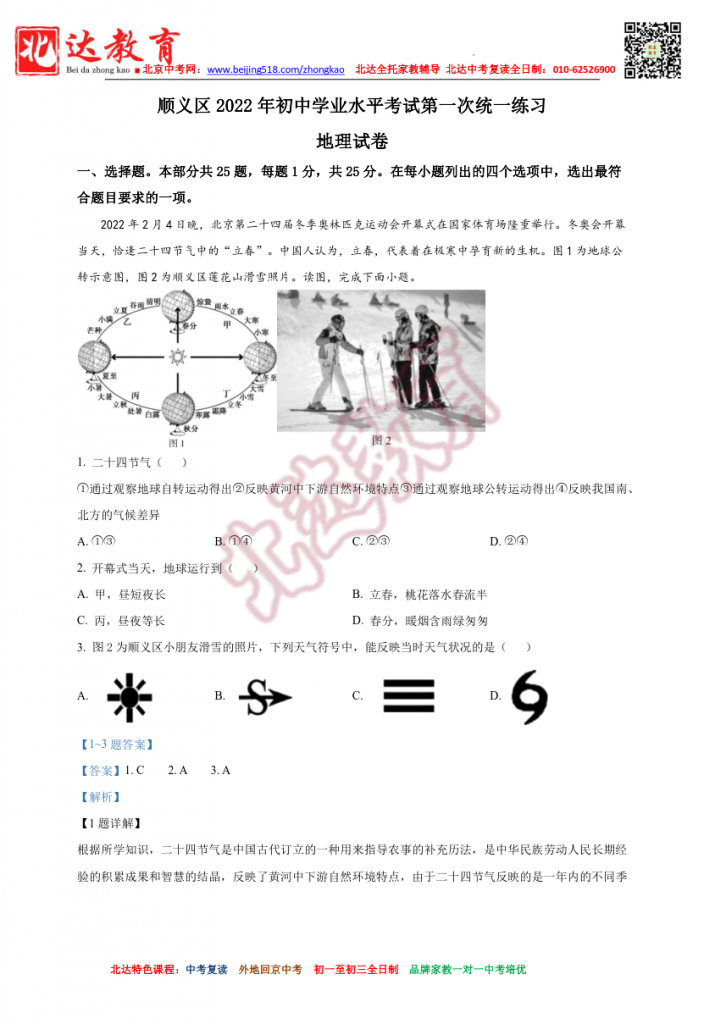北京顺义2022初中一模地理试卷及解析(高清版)。admw360中考复读学校教研组收集整理,分享给大家。