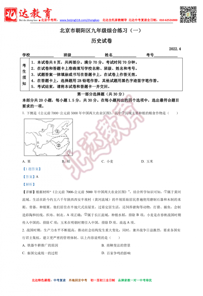 北京朝阳2022初三一模历史试题及解析(高清版)。admw360中考复读学校教研组收集整理,分享给大家。