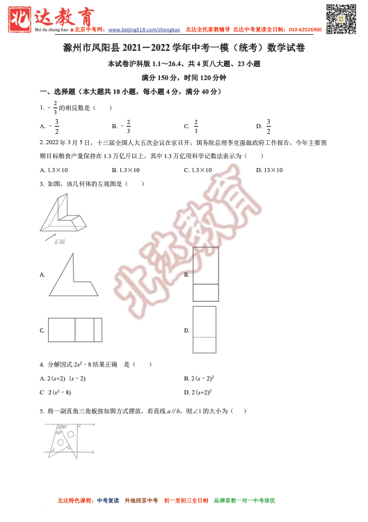 2022年安徽省滁州市凤阳县中考一模数学试题