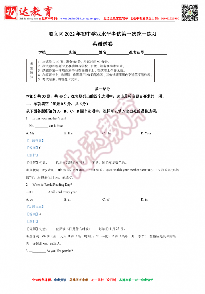 北京顺义2022初三一模英语试题解析(高清版)。admw360中考复读学校教研组收集整理,分享给大家。