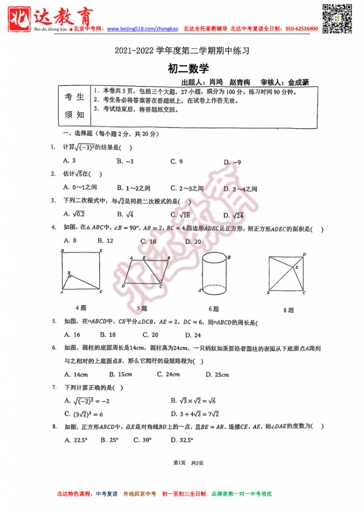 北京海淀教进附属实验学校2022初二下期中数学试卷(高清版)。admw360中考复读学校教研组收集整理,分享给大家。