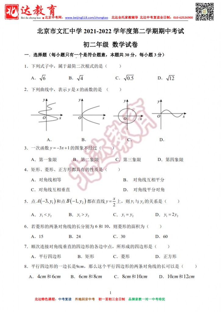 北京文汇中学2022初二下期中考试数学试卷(高清版)。admw360中考复读学校教研组收集整理,分享给大家。