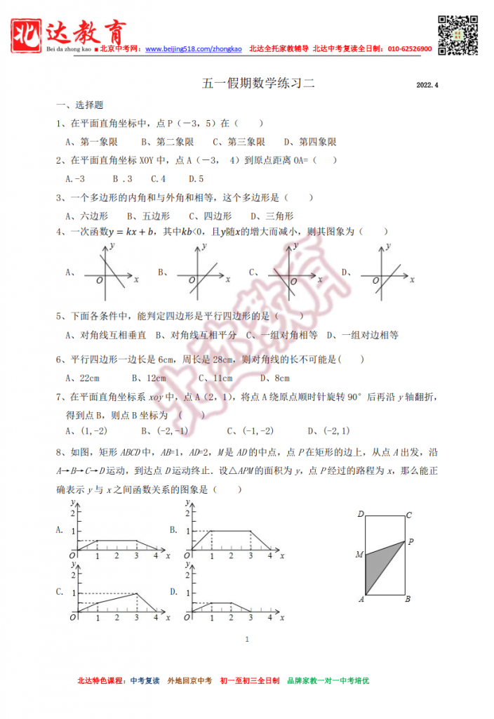 北京潞河中学2022八年级五一假期数学练习二(高清版)。admw360中考复读学校教研组收集整理,分享给大家。